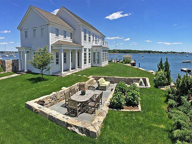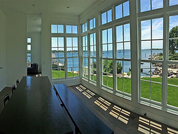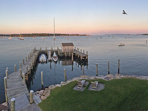This private waterfront location offers the area's most coveted dock with boathouse that will accommodate several boats that draw up to 11' at low tide and is also perfect for swimming, kayaking and rowing. The elegant, contemporary 3 BR main house and separate 2 BR guest house have both been thoughtfully redesigned and rebuilt with all amenities to take full advantage of the unobstructed, panoramic views of the entrance to the Mystic River and Fishers Island Sound all the way to Block Island. Rare property in a charming seaside village.