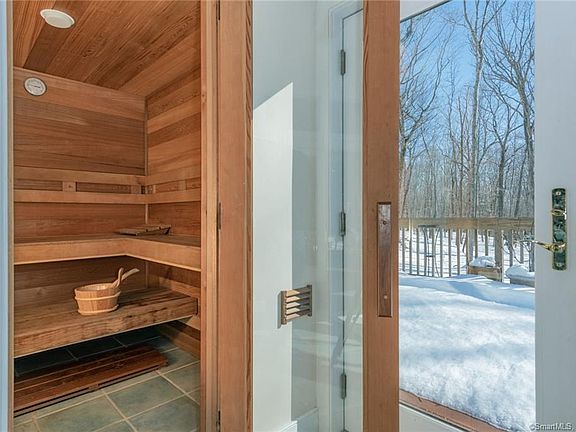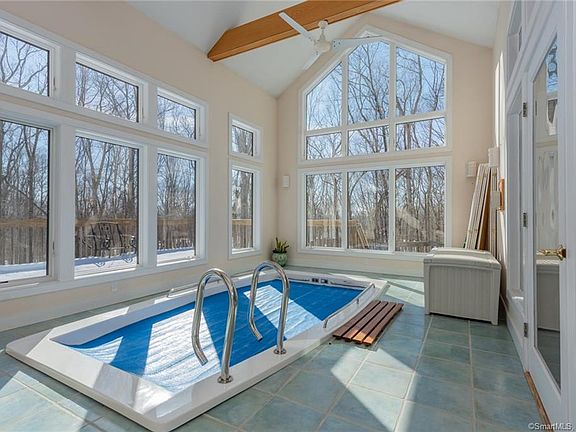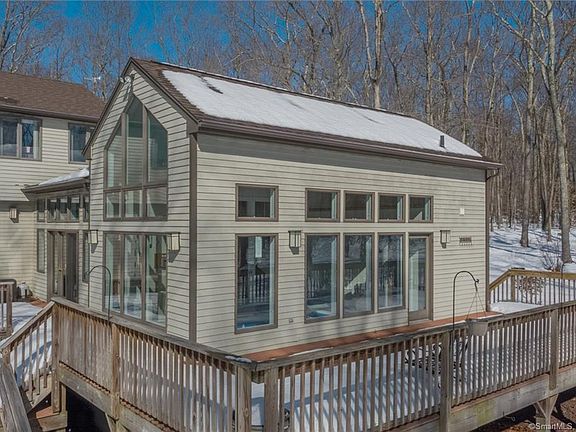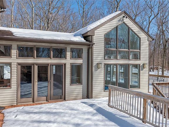 Stunning Moodus Valley Mountain Vista's enhanced by Passive Solar Western Sunsets! This spacious Contemporary is influenced by transitional minimalist elegance. Beautiful oversized kitchen with upscale cherry cabinetry enhanced by granite countertops, cherry paneled refridgerator, stainless appliances including a warming drawer. Oversized walk in pantry with double doors as well as additinal cabinetry & radiant heat flooring in kitchen extending to the great room. The kitchen is open to oversized great room with cathedral ceilings, beams and wetbar with ice maker, beverage cooler and addtional matching built in cabinetry with granite. Double atrium doors to cathdral ceiling sunroom with floor to ceiling windows highlighting nature. This sunroom spa feeling is one that would be hard to resemble in this marketplace. Heated Swimspa with a driving current great for excersize or rehabilitation of anykind. Sunroom also includes authentic sauna with lava rocks & euculyptus if you wish for an enhanced vacation getaway feel. Addtional bathroom and shower in Sunroom. Formal living room with vaulted ceilings & souring floor to ceiling masonry fireplace. First floor master bedroom suite, walk in closet with built in's, CA style & full bath. Two addtional bedrooms upstairs one with a walk in closet. Many addtional closets in this custom home. Walk out finsihed basement and laundry room with cabinetry and sink. Gen. hook-up, Split system A/C units, Buderus furnace recently serviced!