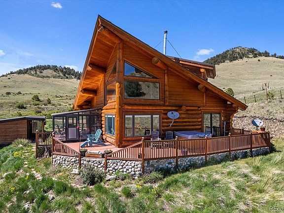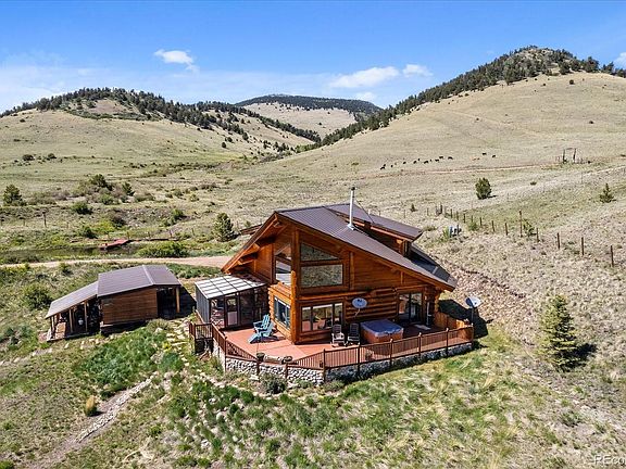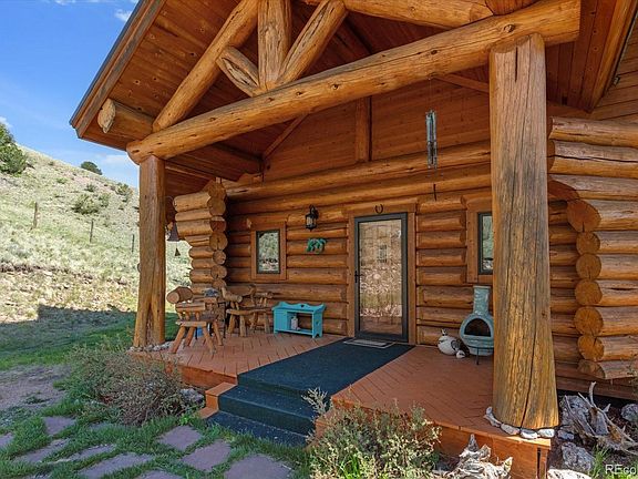 Authentic British Columbia log cabin with year round access! Located in Cotopaxi, the drive up is on easy roads with spectacular views of meadows and rolling hills. There is an electronic gate at the end of the driveway that's part of the cross fencing of the pastures. As you drive up to the house, you see the expansive scenic panorama of more rolling hills, the grass pasture, an aspen grove that lines the ridge, and the snow capped Sangre De Cristo mountains in the distance. The house is a stately log cabin built out of logs from British Columbia. It is positioned expertly to capitalize on every angle of views. Inside is cozy and efficient with the logs exposed throughout. This home is all electric. The kitchen fully functional with full size appliances including a dishwasher. Huge windows in the living room perfectly frame the backyard and the wood stove will keep the whole house warm on winter nights. There is a primary bedroom on this main level with an exterior door to the hot tub on the wrap around deck. A bath with a walk in shower is next to the bedroom, and there is a laundry closet with a stacked washer and dryer. Off the kitchen is a sunroom that also leads to the deck. Upstairs is another bedroom, a full bath, and a sleeping loft. Outside, there is a detached carport with a dog kennel and a storage lean-to behind it. A path leads you over to the barn that has two stalls, a hay storage area, and a surprise room above all of this perfect for a craft room, studio, or more storage. The barn has a water spigot, power, and leads out to the crossfenced pastures. HughesNet has supplied internet to this spot without problem, but it is also a perfect candidate for Starlink. Truly escape to this property and experience the simpler part of this beautiful state. You will never want to leave! We are excited to show you this property so you can see for yourself how breathtaking it is!