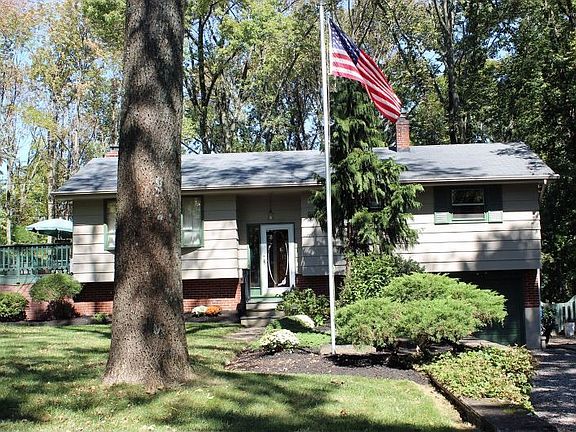 Set on 1.33 acres of sprawling land, this property is beautifully private, buffered by towering trees that create a tucked-away retreat where a large brand-new composite deck looks out on lush greenery. Interiors span 2, 076 s.f., offering 4-beds and 2-baths, with costly upgrades completed in 2015 that include a newer roof, oil tank and boiler. Oversized windows bring natural light into a living room with wood floors, where French doors open to a brand-new deck composite deck, creating a place to enjoy warm summer days with good company. The kitchen offers solid surface counters, a charming window that peeks out at nature, and a newer stainless steel stove and refrigerator (2019). A large dining room has dual pane windows that frame treetops, with the main floor also offering 3 bedrooms with custom California closets, and a full bathroom with a dual sink vanity. On the lower floor, a pellet stove brings warmth to a family room that connects with a sunny patio; a gorgeous wall of rustic masonry here opens to a large lawn where a gazebo with built-in seating creates a place to relax in the outdoors. The lower floor is completed by a private bedroom and a full bath that creates the opportunity for multi-generational living, as well as a laundry room and access to the 1-car garage. A convenient location is nearby to a park w playground, and a nature preserve with hiking and scenic stream, and is just minutes to dining on Main Street, and shopping at Costco and other big box stores.