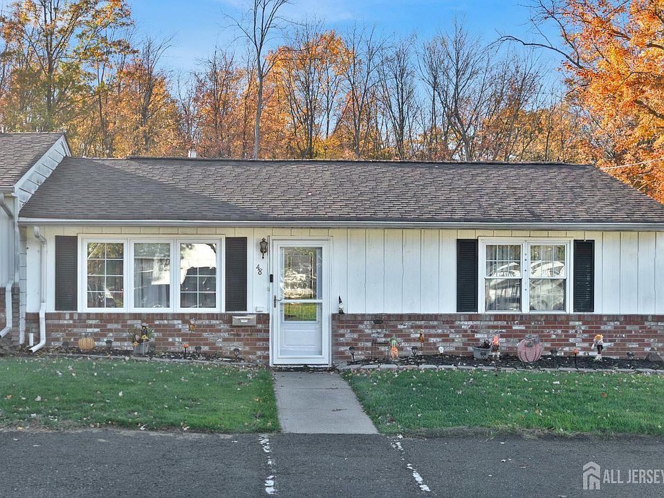 Welcome home to this stunning 2 bedroom, 1 bathroom Ranch Style house backing up to peaceful woods in pet-friendly, over 55 community of Cheesequake Village. This coveted end unit model offers the safety and convenience of one level living with no one above you, Inside, you'll find a spacious living room, dining room combo, updated kitchen with a convenient laundry closet and the washer and dryer are included. From the Kitchen transiton to a spacious 4-Season Sun Room. Both bedrooms are generously sized, offering plenty of space and natural light. The home features a 4 year old central air unit, a newer roof (just 3 years old), and low property taxes and monthly HOA fee. Assigned parking is in front with visitor parking nearby. Newer appliances and 8 year old flooring complete the house. A wonderful outdoor pool, bocce courts and more, provides fun for the Better at 55 adults who live and love being in Cheesequake Village.