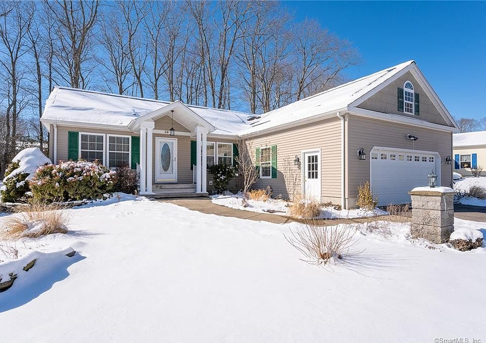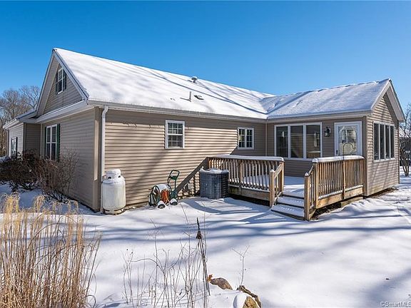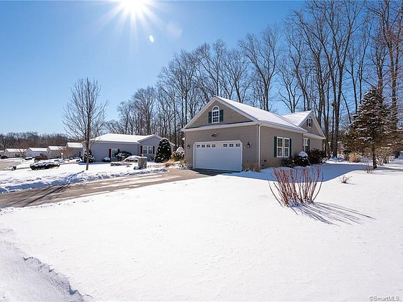 Active 55+ community centrally located between Norwich and the Long Island shoreline. This spacious home offers two bedrooms located on either end of the home for privacy. The Master Bedroom has a full bath with walk-in shower and double sinks along with a walk-in closet. The 2nd bedroom has a full bath right outside the door. The front entry has tile floor leading into the carpeted living room. The half-wall between the living room and kitchen gives an open and airy feel to the living space. The kitchen has newer appliances and a breakfast bar. The dining area enjoys views offered from the four season sunroom and generous windows overlooking the back yard. Sit outside on the deck for summer dining or just relax and listen to the birds. The insulated attached garage opens into the mudroom/laundry room and makes entry into the home a breeze all year long. Plenty of storage is available in the basement and full attic. Community amenities include a heated indoor pool, spacious clubhouse and fully equipped fitness center.