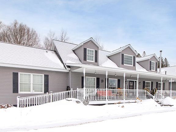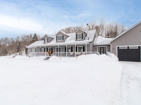 The Northeast Kingdom of Vermont is one of those places you have to see. This home is in a desirable location right on the VAST snowmobile trails and just outside of town. The view looking out from this classic cape is of mountains and the Village of Canaan. Look out at the sunset, while sitting at the concrete firepit, and stamped patio, with well done landscaping, decks, porch, and hot tub. This home has 4 bedrooms with the Primary Suite offering a stone and tile shower plus jet bath perfect for standard or handicap use. The main living area encompasses a large open kitchen, dining, living space, all with beautiful natural light and lofted ceilings. And there's the oversized 2-car garage and game room complete with a full bar that's great for entertaining!