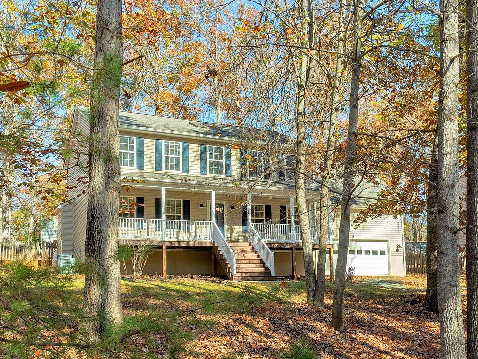Lovely home nestled on a tree-lined street within the gated lake community. Spacious Primary Suite boasts vaulted ceilings and room to relax & treat yourself to a nice soak in the jetted tub or separate shower in ensuite. As you enter, you will notice the warmth the home exudes with the beautiful wood trim, farmhouse modern lighting & hardwood flooring. Cozy up next to slate surround fireplace & hearth in family room which opens to Kitchen featuring an island, stainless steel appliances including a double oven, ample wood cabinetry & pantry. French doors allow in natural lighting and connect the kitchen with Dining room which features crown molding & chair railing. Enjoy time outdoors on your expansive rear deck & fenced in backyard with playset. Sip a nice drink from the freshly sealed covered porch. 5th bedroom could be used as a bonus room or study. New carpet upstairs as well as the living & family room. Near Beach 3, golfing, & shopping via Fairview gate. Lake Monticello offers access to amenities including: pool, beaches, tennis/pickleball, trails, playgrounds, clubhouse & more! *360° Virtual Tour Available*