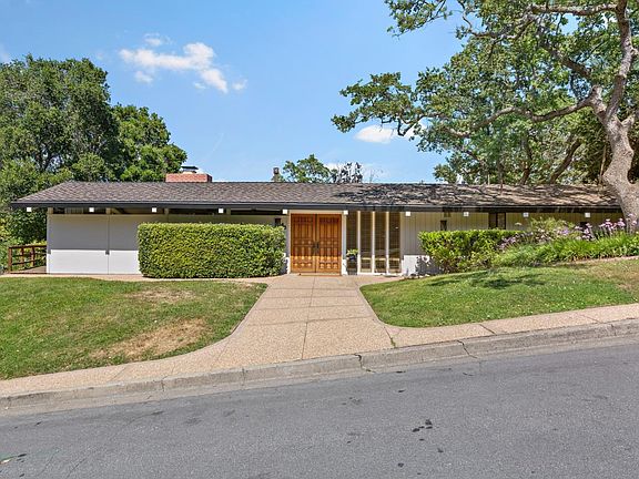 Located on one of Ladera's most desirable streets, this home offers the perfect blend of style, functionality, and comfort. Experience classic mid-century aesthetic with vaulted ceilings and expansive walls of windows that seamlessly connect the indoors with the outdoors. The family room has a cozy gas fireplace and lots of built-ins that include two pull-down tables perfect for work, study or hobby. Light and bright, the primary suite includes a walk-in closet and tucked-away bonus home office, providing a quiet space for work or study, plus stunning views of the backyard. Two bedrooms share a bathroom equipped with a Sauna. Formal dining room, built for hosting large gatherings, has a vaulted ceiling & ample built-in storage. Eat-in chef's kitchen has high-end app, lots of custom cabinetry, and granite counters, making cooking a snap. Enjoy your private backyard oasis featuring a stunning black-bottom pool and spa, ideal for hosting summer gatherings and relaxing with family and friends. A bonus 1 bedroom, 1 bath ADU is perfect for visiting guests or family members, offering them a private and comfortable space with private entry. Convenient to the Ladera Recreation Center, school bus stop, Stanford, easy access to Silicon Valley, commute routes & mid-way between SFO & SJC