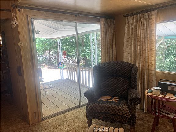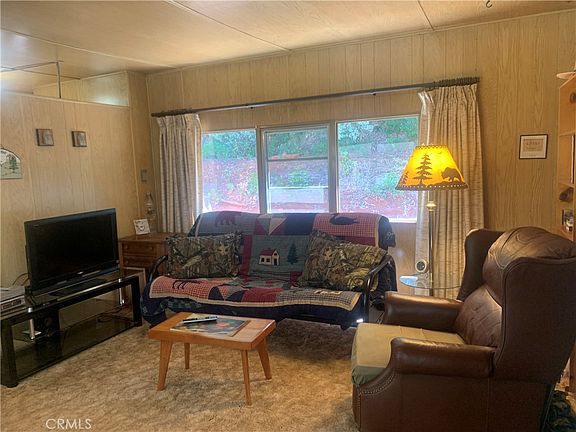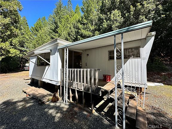 Tucked away on 3.88 acres surrounded by tall pines, sits this well maintained 2-bed/2-bath vintage single wide mobile with pop-out. This hidden gem offers cozy and inviting living spaces featuring tile countertops in kitchen, a designated eating area, a comfortable living room with additional square footage provided by the pop-out creating a more spacious and open living room enhanced with a sliding glass door that opens to front deck, built-ins in both bedrooms, indoor laundry area with w/d hookups, and a hall pantry. Explore the convenience of the included 8 x 20 storage container providing ample space for storing tools, equipment, workbenches, or create your own space. The addition of this newer storage container enhances the property's utility and offers versatility for various storage needs. Located a mere 10 miles above Lake Oroville, consisting of two parcels totaling 3.88 acres, is easily accessible with two access roads and a short distance off the pavement for easy commuting. This property presents a rare opportunity to own a clean and cozy retreat surrounded by nature's beauty. Perfect for those seeking a peaceful and secluded lifestyle while still being close to the lake and other amenities in a picturesque natural setting.