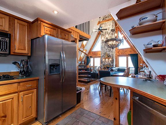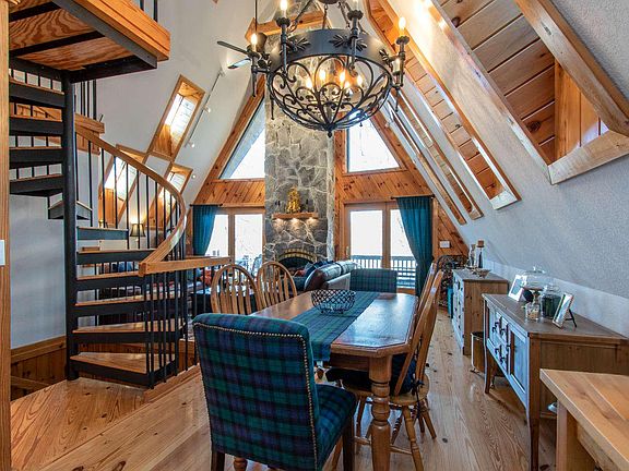A Frame style Cabin overlooking Lake Appalachia! This unique and sparkling home is the perfect retreat. Attached 1 car garage has space for your vehicle& your tools. The interior is a delight for the eyes. Kitchen is open to the living room/great room perfect for entertaining. Skylights let natural light pour through. Stone fireplace from the floor to the ceiling. Ascend the spiral stair case to the master suite. Master suite has bonus room currently being used for an office! Full basement is perfect for get togethers or get away's with a wet bar, pool table, and half bath. Laundry room and large storage closet in basement l! Main level deck features seasonal views of mountains & lakes. Firepit on lower level. Furnished! Welcome to your mountain dream! **NO DUAL AGENCY** Internet is Sat.