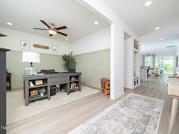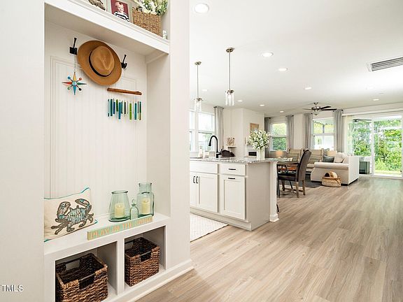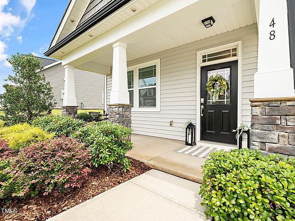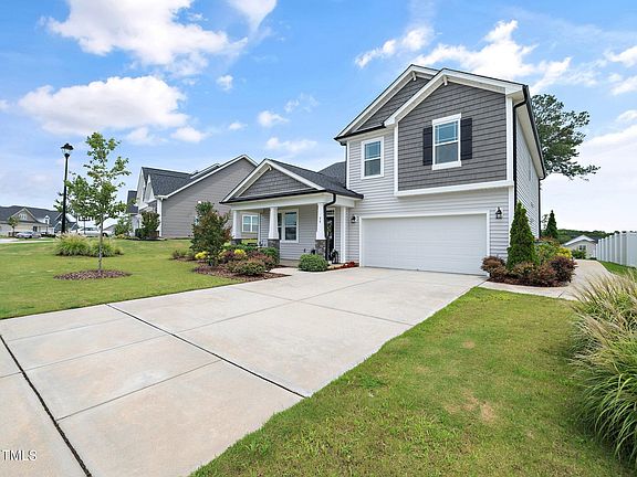 Former Model Home built in 2020 is a must see. Features a flex room (great for an office, library, exercise room etc.)with beautiful wainscoting. The foyer leads you to your open kitchen with gorgeous island and walk in pantry that's perfect for entertaining. The kitchen is open to the breakfast/dining and family room. Tucked away on the first floor, is the large primary bedroom retreat with bath. The stand-up shower has beautiful ceramic tile and a H2O closet. As you venture up the 4ft. wide stairs, the HUGE loft welcomes you with endless possibilities (movie room, game room, pool table, gaming room, craft room etc.) There is a guest bedroom on the second level that has it's own private bathroom. There are also two additional bedrooms and one additional bath upstairs. The covered rear porch allows you to relax and enjoy the privacy and beauty of this .30 lot, upgraded neutral flooring, an irrigation system, an upgraded appliance package with professional gas stove, built-in bookcases, wired for speakers in the kitchen/living room, master and upstairs living room, wooden custom blinds, a 30k upgrade of a bedroom and bath suite upstairs, upgraded landscaping and a sidewalk to the backyard. The staircase is four foot wide, The pantry and linen closets provide great storage Also the garage is finished and has a storage room. This home is less than 30 mins to downtown Raleigh. . Across the street from Thales Academy and American Leadership Academy is close by. Quiet and safe neighborhood, Low HOA cost for the Triangle. House sits on 1/3 of an acre lot without a neighbor in the back.