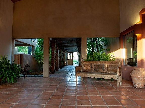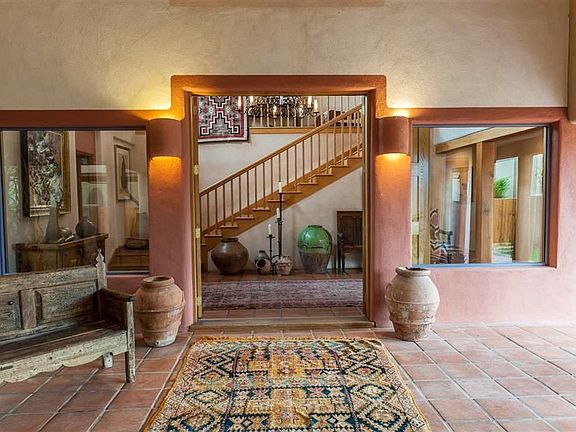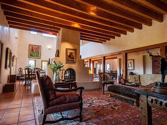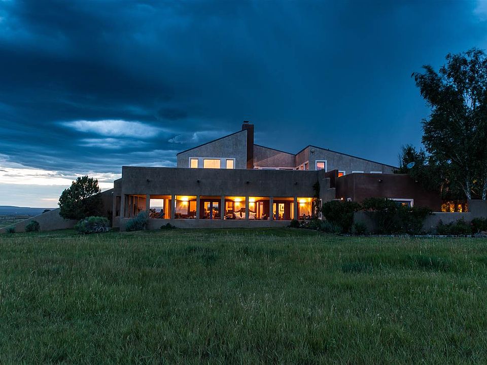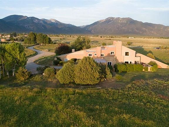 Introducing the Mariposa Ranch of Taos. Described as "a poem on the landscape" by Architect Antoine Predock, this majestic 5,000+ square foot home was designed as a surrogate mountain nestled on the vast plain of Des Montes between the Town of Taos and Taos Ski Valley.The home sits on a 19 acre parcel surrounded by over 1,000 acres of largely undeveloped land. The results are staggering 360 degree vistas of endless sky and unparalleled views of the Sangre de Cristos to the East, Pedernal and the geometric expanse of the western horizon and the snow-capped Truchas mountains to the south. An adobe wall at the entrance provides a gracious envelope to draw one in from the vast expanse of surrounding land. There is a honeysuckle covered trellis that directs visitors to the grand entrance of the home flanked by a beautiful fountain and charming guest house to the right. Once inside, you will see the interior and exterior staircases and bridge that serve as the north-south axis or crossroads of the house with the living spaces set off to the sides. This house was designed and built with entertaining in mind. There is a 3,000 sq ft covered portal surrounding the living and dining areas. The 35' ceilings in the living and dining areas are framed with enormous windows to preserve the feeling of an extension of the gorgeous setting and panoramic expanse.There is a cozy library/den with a low ceiling and a wet bar off the grand living area. The master suite has a private east facing patio perfect for enjoying the serenity of a sunrise over Taos mountain.This horse property includes a corral, stable, exercise room and greenhouse in a separate building and 16 acres of water rights. The Mariposa Ranch house offers a feeling of seclusion and privacy while being only 20 minutes from the Town of Taos and Taos Ski Valley. This is a rare opportunity; a sophisticated yet comfortable home with ample room and privacy and a thoughtful nod to the traditions and designs of the ancestors that first settled in this area of Northern New Mexico.