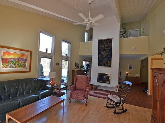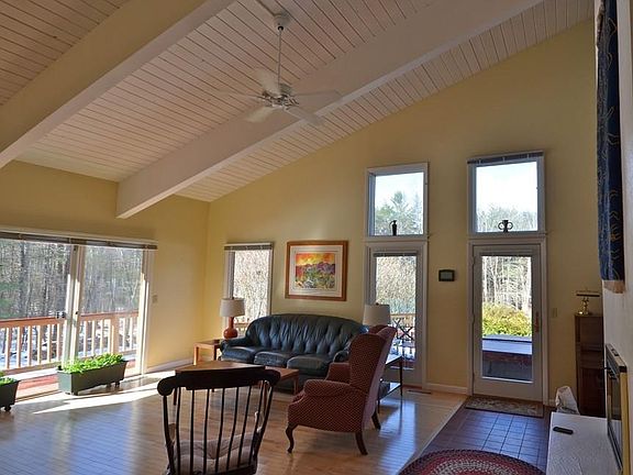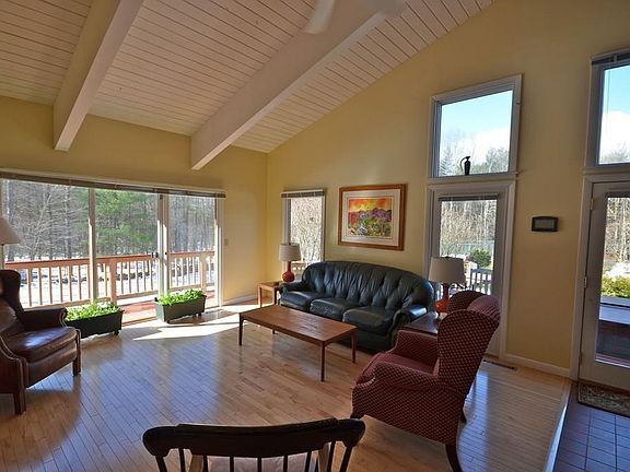 Anchored on 6+ private acres of peace and serenity abutting conservation land you'll fall in love with this custom built Contemporary offering 4 bedrooms, 3 baths with an appealing open concept with skylights & beamed cathedral ceilings. Entertaining family & friends is a joy in the updated spacious kitchen with maple cabinets, Ashfield stone, island and pantry opening to a large family room outfitted with a fireplace, sliders to decks and dining area. There is a first floor bedroom, plus a master suite on the 2nd floor with an office and master bath. Two more bedrooms offer a climbing ladder to loft space for creative play. The walkout lower level offers another family room. Outside you'll enjoy decks, in-ground pool and level yard/land ready for gardening, play, or just kicking back and enjoying the quiet solitude. You are only 10 minutes to Amherst center & UMass - this is truly a special place to call home!