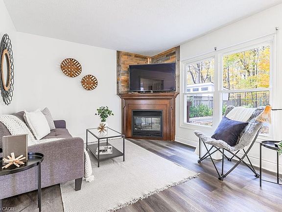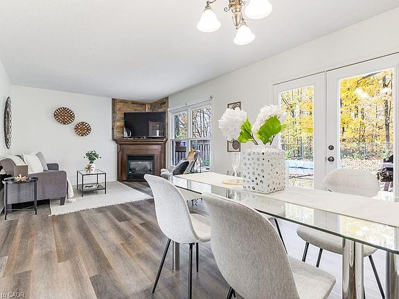 Welcome to this charming three-bedroom, one-and-a-half-bathroom two-storey home located in the quiet town of Caledonia. Nestled on a private lot backing onto a school and wooded area, this property provides a rare sense of privacy with no rear neighbours. The main level features a bright eat-in kitchen with white cabinetry and granite countertops, opening into a spacious living and dining area highlighted by a cozy gas fireplace and French doors that lead to the backyard. Upstairs, the primary bedroom offers a large closet, complemented by two additional bedrooms and a four-piece bathroom. The finished basement extends the living space with laminate flooring and a second gas fireplace, creating a comfortable setting for relaxation, gatherings, or a home office. Outdoors, enjoy your own retreat with a 15x30 chlorine pool, hot tub, and forested views that set the tone for entertaining or quiet evenings at home. A heated double-car garage adds practicality with inside entry, backyard access, a gas heater, and a bonus storage or workshop room behind the garage, providing excellent space for projects year-round. Located within walking distance to schools, parks, shopping, and community amenities, this home offers a blend of comfort, functionality, and lifestyle in a sought-after neighbourhood.