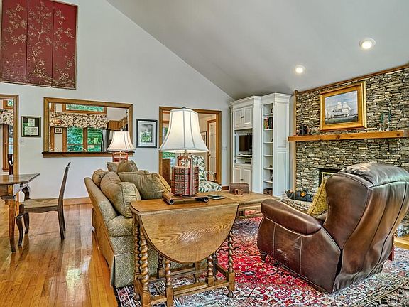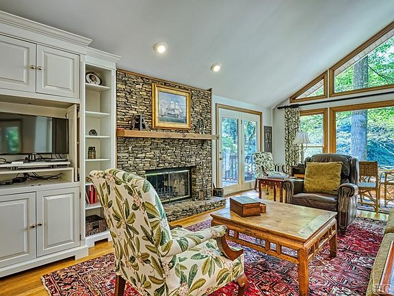 Lake Sequoyah Located right on the water, this lovely mountain contemporary has 3 bedrooms and 4 bathrooms. Split upper bedroom floor plan encompasses a large primary suite with fireplace, and a great room with cathedral ceilings, fireplace, covered porch and pass-through kitchen. Guest wing has 2 bedrooms and 1 hall bath. There is a large 2 car garage. Lower level has a full bath, and a bonus room with a deck that flows to a dock on the lake. It has a great private setting.