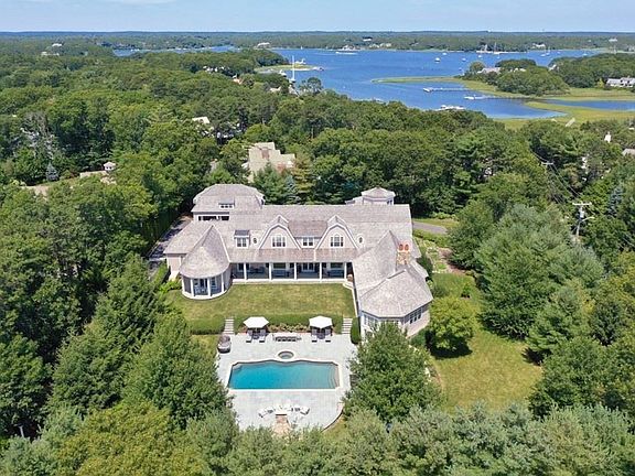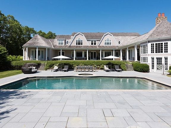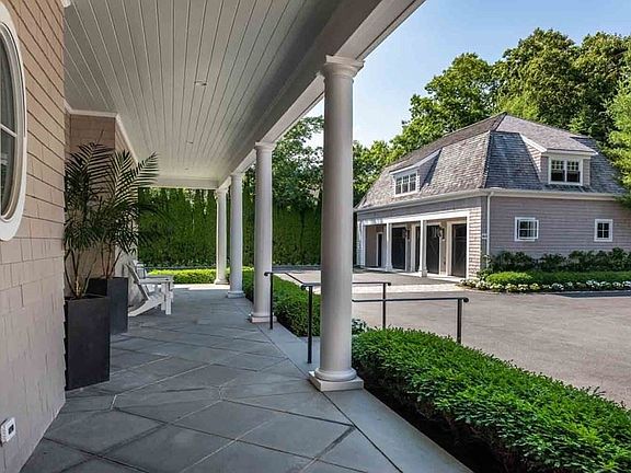 Tucked away on a private drive is this stunning contemporary residence located in the gated community of Oyster Harbors. A grand foyer leads to the beautifully designed interior spaces with soaring ceilings, gleaming hardwood floors and rich architectural detailing. With 9,859 sq. ft. the main residence offers a total of 5 bedrooms. The principal rooms are adorned with columns providing the ideal backdrop for formal entertaining. There is a spectacular centrally located gourmet kitchen, fabulous great room with custom stone fireplace, luxurious 1st floor master suite with adjacent office, a light filled garden room, formal living and dining rooms, breakfast nook, butler's pantry as well as on the second floor four bedrooms, a large office/playroom and spacious media room. This magnificent residence sited on 1.52 acres features a lavish outdoor environment complete with in-ground pool, outdoor fireplace, gardens, lawns, ample patio spaces, and two garages. Deeded beach & dock rights.