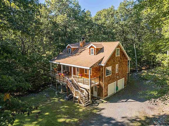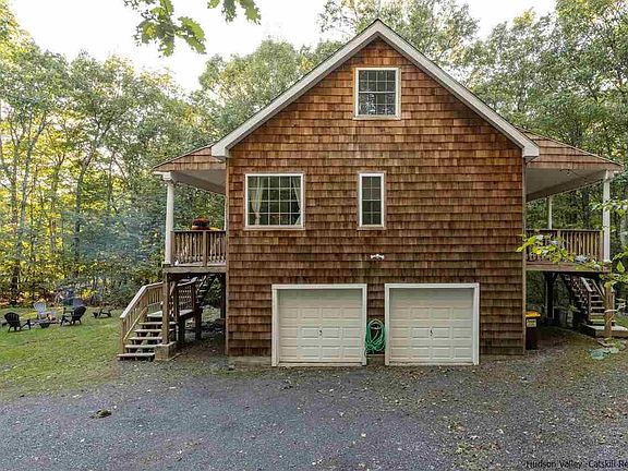 Set back from a private road and surrounded by mature trees and natural rock formations, this custom cedar-sided contemporary cape on 2.4 wooded and private acres is a fantastic mountain retreat. The property is located just 7 minutes from the coffee shops and eateries in Catskill, 15 minutes from Hudson and 20+ minutes from the ski areas of Windham and Hunter Mountain. Lovingly cared for and meticulously maintained, the property offers two covered porches that run the entire length of the house and provide an abundance of space for sheltered outdoor living. A large firepit, a staple of upstate living, is a great spot for relaxing with friends and family. Inside you'll find an open living space, a floor-to-ceiling stone fireplace and natural wood oak floors. Thoughtfully placed windows allow plentiful natural light in the main living space. An open dining area leads into the eat-in kitchen with wood cabinets, a breakfast bar, attached laundry, and a separate pantry. The first-floor ensuite primary bedroom is a relaxing haven and includes a custom wood-built electric fireplace, inset ceiling design, and private walk out onto a covered back porch surrounded by dense forest. This ensuite bathroom is outfitted with a deep jetted soaking tub. There are two additional bedrooms upstairs with a full bathroom and additional storage. A full, separately zoned walk-out basement with an attached two-car garage and an additional 500 square feet of partially finished and unfinished space, provide potential additional living space. The property is perfect as both a full-time retreat or weekend escape.