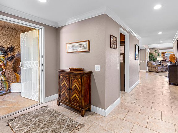 Recently remodeled, turnkey, south/east-facing 3 bedroom / 2 bath condo located on hole #7 in beautiful Chaparral Country Club. Upon entry you notice the meticulous attention to detail and spacious open floor plan. The great room offers vaulted ceilings, bar, and fireplace. The well-proportioned kitchen opens out to the patio providing a perfect space for outdoor dining and lounging. Primary bedroom is ensuite, bathroom features dual vanities, shower and jacuzzi tub. Separate laundry room. Attached, finished 2-car plus golf cart garage. Upgrades include - enclosed atrium, golf cart garage, custom kitchen cabinets, stainless steel appliances, remodeled bathrooms with custom finishes, stamped colored concrete walkway, newer A/C, crown molding, glass block privacy wall, outdoor trellis, outdoor patio heaters in ceiling, extended patio, and spectacular golf course & mountain views. Desirable interior location and community pool is just steps away. HOA includes: 24 hr guard-gated security, cable/ internet, roof, exterior paint, trash, earthquake insurance and landscaping. Plus, social & fitness membership and numerous dining choices. Chaparral Country Club is in the heart of Palm Desert minutes away from dining, shopping, and entertainment.