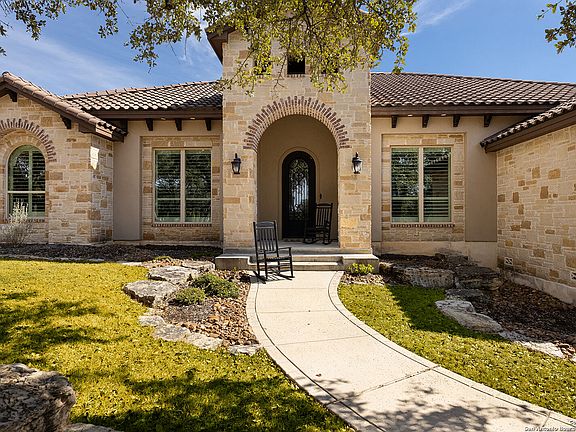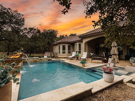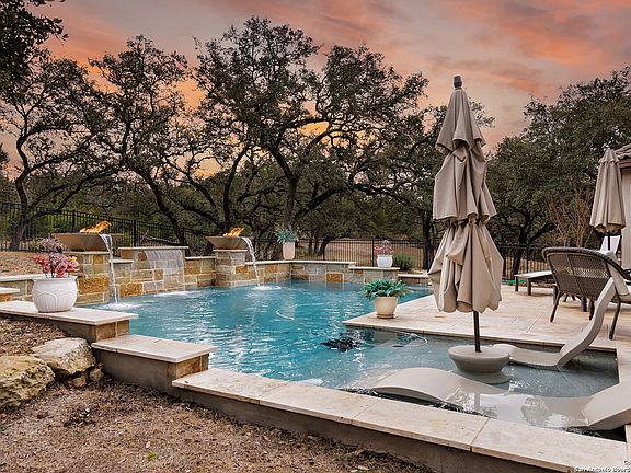 Beautiful 1-story custom home located in the gated community of Stone Creek Ranch in the City of Fair Oaks Ranch. The stone & stucco exterior & setting offers noticeable eye-catching curb appeal as you pull up to the driveway at the end of the cul-de-sac, & the lot & newly built pool is surrounded by trees backing up to a 2 acre community greenbelt buffer. Easy access in & out of neighborhood, walking distance to the SCR HOA Clubhouse offering a pool & Lazy River, Fitness Room, & playground. Location is convenient to all things Boerne, Fair Oaks Country Club, The Rim, & La Cantera, while feeling like you are 'away' on your own private oasis. Interior offers vaulted ceilings w/ numerous custom touches & built ins. Formal dining, custom study/office off entry, & an open floor plan. Hardwood & tile flooring throughout, no carpet. Kitchen offers gas cooking, Jenn-Air appliances w/ a generous island & large pantry perfect for entertaining. Primary suite is split from other bedrooms offering privacy, natural light, a sitting area, & a beautiful spa-like shower & tub. Very spacious primary closet w/ built-in storage. Two guest bedrooms have large ensuite baths & walk-in closets. Large flex room currently serves as an informal living room, but is easily flexible to serve as a 4th bedroom with nearby full bath, or game room.