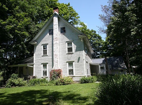 This charming farmhouse in Roscoe is full of original features with high ceilings, 5 bedrooms, 2 baths, plaster walls and vintage detailing, and an attached garage. The 1.14-acre lot features Catskill Mountain views, a stream, stunning weeping willows, apple and pear trees, lilacs in spring, tiger lilies in summer, and offers both privacy and proximity to town. Third floor has studio space, and room for an extra bedroom. Hardwood floors, a stone fireplace, woodwork and period details provide warmth and character. The house received a new roof in 2006 with architectural shingles and a new boiler in 2005. Needs some TLC to complete renovations but is move-in and 'all-season' ready. Walk to the shops downtown or to the bus to NYC.