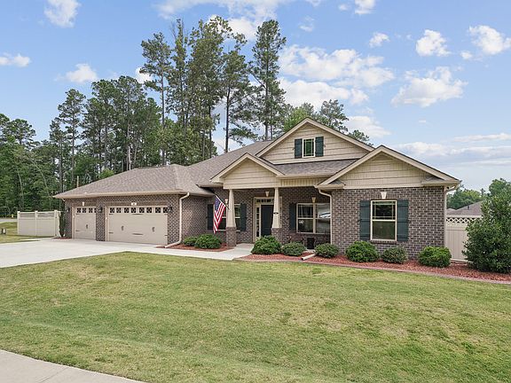 Situated on a great lot backing up to serene wetlands, this property offers attention grabbing curb appeal, a highly sought-after Ranch floor plan, and a 3-car Garage. As you enter the beautiful foyer, on your right there is an Office with French doors and on the left a Dining Room featuring a tray ceiling. Upgraded light fixtures and crown molding throughout the home enhance its warm and inviting ambiance. The Family Room, with its vaulted ceiling and fireplace, seamlessly opens to the eat-in Kitchen with bar seating creating an ideal space for entertaining. The Kitchen is embellished with beautiful cabinetry, Granite counters, stainless steel appliances, and a stylish tile backsplash. You'll love the Primary Suite with tray ceiling, two walk-in closets, large shower with bench seating, and direct access to the screened patio. Outside, the screened patio opens to a large extended patio overlooking the backyard and wetlands for peaceful outdoor moments and/or entertaining. The sidewalk in front of the residence leads to River Park and other nearby parks with playgrounds, baseball and soccer fields, riverfront walking trails, and access to tubing on the Cape Fear River. Washer, Dryer, Refrigerator, and all TV's convey, adding extra value and convenience.