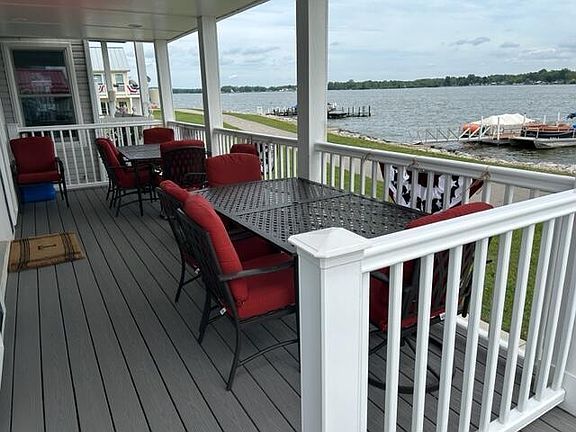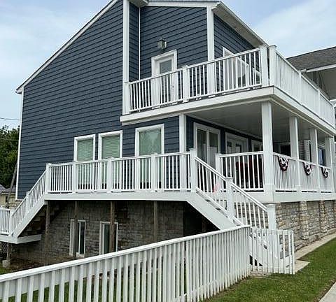 Beautiful LAKEFRONT 3 bedroom, 2 1/2 bath home on bike path on the North Bank in Buckeye Lake! Walk to local restaurants, shops, breweries, or Yacht Club! Boat dock area in front of home! House has such charm & character and is beautifully painted and decorated. Open concept kitchen, dining, and living room with spectacular views from all rooms! Second floor owner's suite bedroom & another bedroom both offer exquisite outdoor deck areas for privacy and fantastic views! Lower level has a HUGE bedroom, approx. 600 additional square feet, with a walk out to the back of the house. Newly painted siding & new hot water tank. Brand new standing seam metal roof July 10, 2023! Extra parcel for parking. Call for a showing today to enjoy the lake for the rest of the summer!