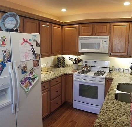 LOTS OF LIGHT in this END UNIT on CORNER LOT and extra green space, too! Well maintained Town Home offers hardwood floors throughout. Granite counter tops in the Kitchen and Bathrooms. Spacious Living Room with gas log fireplace,. Nice Pool and Clubhouse with beautiful long range Views! Convenient to shopping and schools.