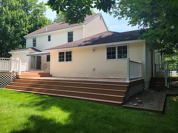 Vermont Castings wood stove in living room fireplace next to built-in bookcase. Sliding doors from dining room to deck. Hardwood floors throughout. Mudroom with pantry. Workshop addition on the back of the two-car garage. Partially finished basement with built-in desk is perfect for a home office, work-out room, or playroom. Large main bedroom with double closets, built-in bookshelves, and private bath.
