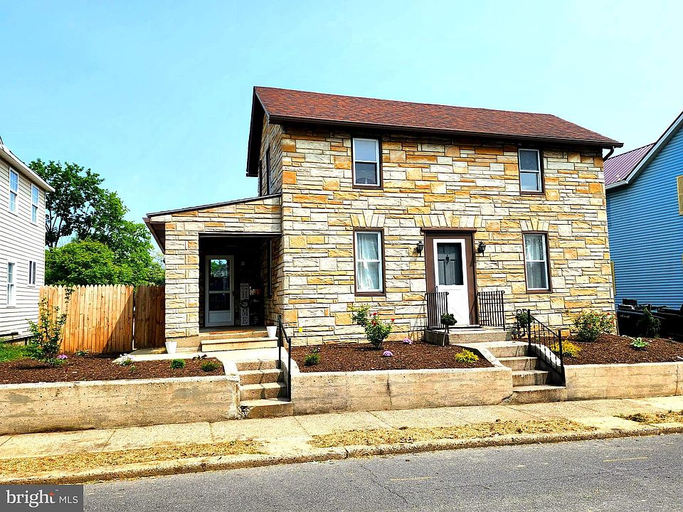 NEW PRICE!!! This charming stone home features three bedrooms and one bathroom. It boasts a covered porch at the front and a rear deck, perfect for relaxing or entertaining outdoors. The main level showcases beautifully refinished wood floors, adding a touch of elegance to the living space. New flooring in kitchen and mud room! Additionally, the property includes a convenient one-car garage for parking or storage. Inside, you'll find a decorative fireplace that adds character and warmth to the home. All Appliances convey! The location is highly desirable, as it is close to all amenities, making shopping, dining, and other conveniences easily accessible. Furthermore, the rear yard is fully fenced, providing privacy and security for you and your loved ones. Overall, this home offers a blend of attractive features, both inside and out, making it a great place to call home. Schedule your appointment today!
