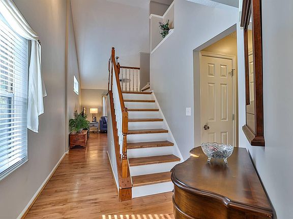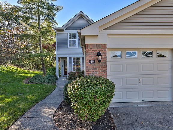 This beautiful end unit with a private wooded view is a rare find! TWO master bedroom ensuites with adjoining Jack & Jill baths! Spacious primary is located on the main level! Gorgeous hickory hardwoods flow from the open entry through the main level & 2 story staircase. Stunning updated modern light fixtures & ceiling fans highlight the vaulted ceilings. Large garden soaker tub. Gorgeous kitchen cabinetry with granite countertops. First floor laundry. Attached garage and private parking in the driveway. Covered front porch. Amenities include an enclosed dog park, in ground pool, clubhouse & more!