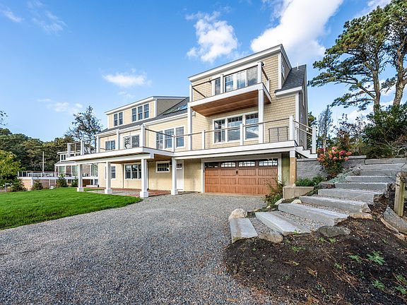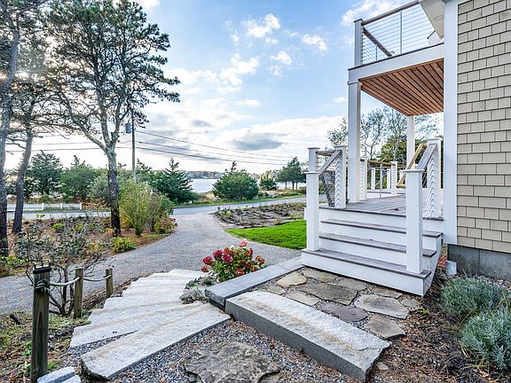 Water views from almost every room! Association Beaches and Dock! Located in one of Chatham's most picturesque neighborhoods, this newly renovated and expanded residence has undergone a thoughtful transformation that now highlights stunning water views of saltwater Crow's Pond. Upon entry, you'll be greeted by an impressive foyer that welcomes you to both the common and private areas of the home. The open floor plan of this 4-bedroom home is enhanced by gorgeous white oak flooring, crown molding, and recessed lighting throughout. The home features a state-of-the-art kitchen with top-of-the-line custom cabinetry, Thermador appliances, leathered Quartzite countertops, and custom tile work. A pillar flanked sunroom with sky lights and bank of windows perfectly frames westerly views of the water. A nearby living room with a wood burning fireplace is surrounded by custom woodwork creating an impressive focal point. Completing the first floor is one of two primary suites, having captivating water views and a spa-like bathroom with high-end fixtures, a spacious office with views of Pleasant Bay, laundry room with Quartz countertop, powder room, and a California Closet pantry. On the second level is an additional primary suite showcasing glass sliders leading to a private balcony with wonderful water views, a luxurious bathroom with soaking tub and double vanity, and two walk-in closets. Additionally on the second floor, another loft-office greets you at the landing with views of Crow's Pond, as well as a bedroom, exceptionally appointed full bathroom, and closet. The lower level provides a bright family room with custom built-ins, wet bar, brick hearth, a bedroom, full bath, 2 utility rooms, and easy garage access. Two driveways, with one leading to a 2-car garage, provide plenty of parking. Professionally landscaped, the home features an artistic blend of brick walkways, natural stone steps, and native plantings. The home has an enclosed outside shower and there is room for a pool if desired. This offering is part of the Eastward Point Property Owners Association, giving easy access to a deep-water dock across the street, mooring, and multiple private beaches on Pleasant Bay, Bassing Harbor and on Crow's Pond.