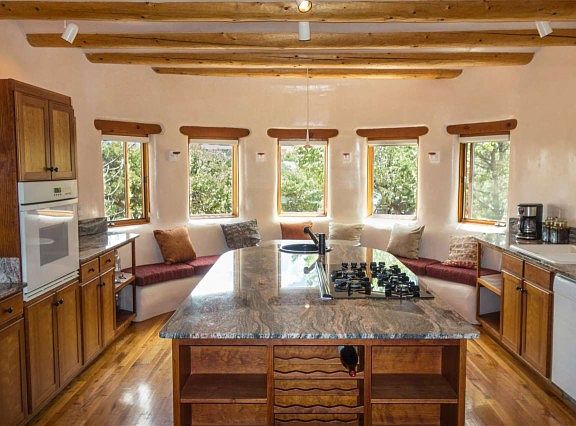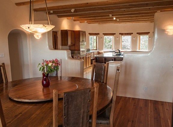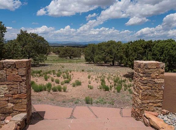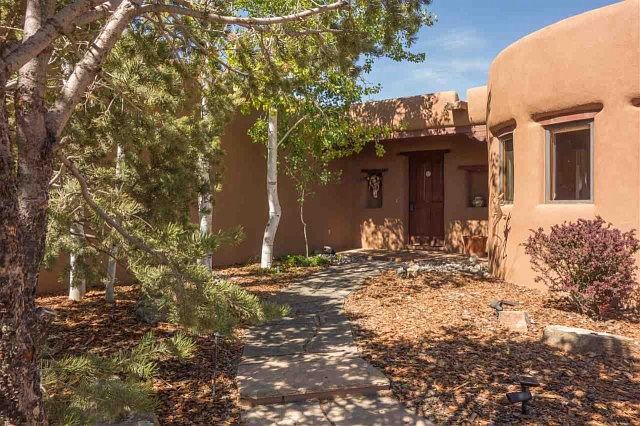 This peaceful and elegant, light filled adobe home has a well thought out floor plan and is in great condition with new exterior plaster, new insulated glass on all glass doors and many windows. The house is sited with excellent views of both the Sangre de Cristo and Jemez mountain ranges. This is a fabulous home for entertaining with a large portal, gourmet kitchen with cherry floors, cherry cabinets and granite countertops. There are 3 bedrooms plus a spacious office/library and an oversized, heated 3 car garage with a large extra storage room. The adobe walls are sensuous and hand plastered and there are high ceilings with split cedar and Aspen Latillas. The guest wing comes with a convenient small kitchen.
