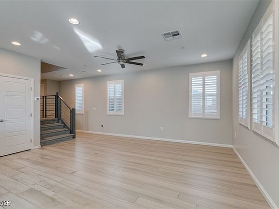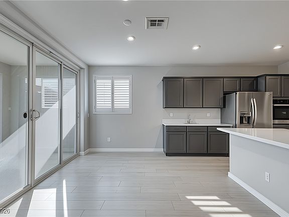 Experience modern living in this stylish two story home located in a gated community in Lake Las Vegas. This residence features contemporary cable stair railing, wood look tile throughout, shutters, and a sleek kitchen with grey cabinets, quartz countertops, and included appliances. Enjoy seamless indoor outdoor flow with a 10' slider leading to a fully finished backyard complete with synthetic grass, pavers, a full length patio cover, and no direct rear neighbors for added privacy. Upstairs offers a spacious loft, and the entire home is truly move-in ready with no additional purchases required.
