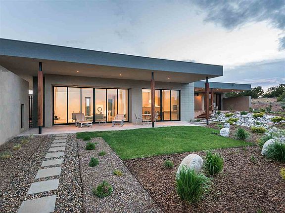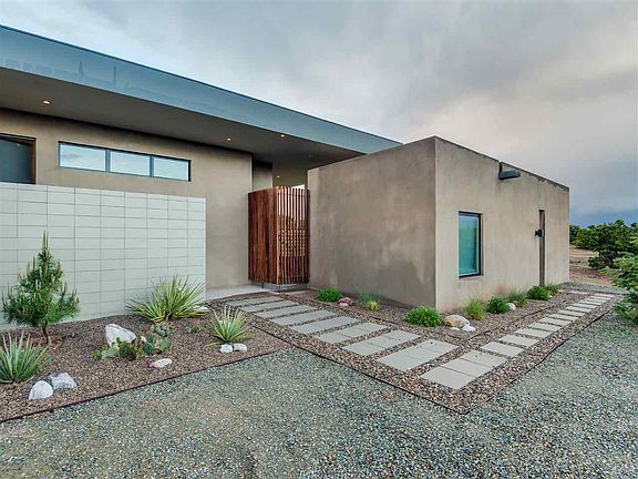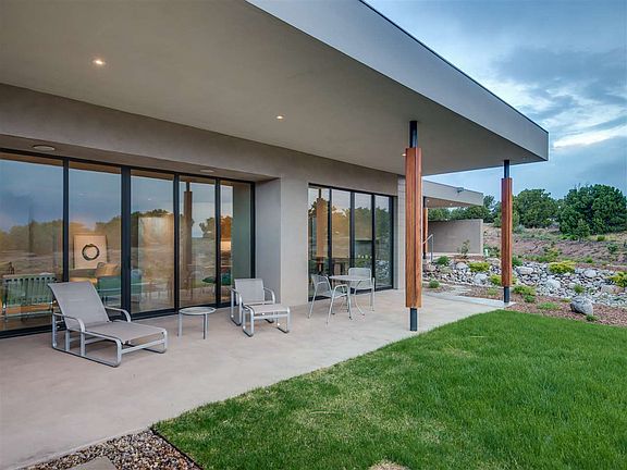 One of the more exciting properties to come on the market in Las Campanas in a long time. This Trey Jordan, 3 Bedroom, 4 Bathroom, custom design contemporary home is perched on the northern part of Las Campanas and is overlooking hundreds of acres of undeveloped land with spectacular views of the Sangre de Cristo's. The 3,400 square foot home features a luxurious master suite with built in humidification, his and hers offices, a yoga/art studio with private outdoor space and bonus room/den. The separate detached guest house shares the views and is a quiet repose for visitors. Beautiful architectural details abound and you are surrounded by spectacular views and numerous patios/gardens.