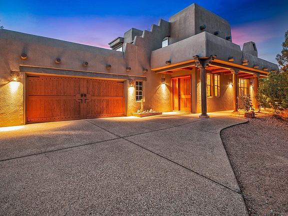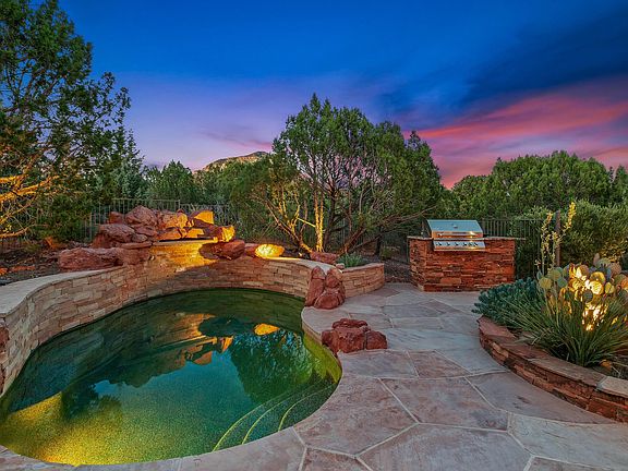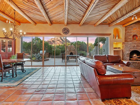 With stunning red rock views and an abundance of privacy on 2 acres bordering National Forest Service, this Two Story home is everything you've been dreaming of and more. From the moment you enter, your eye is drawn to the beautiful grape stake ceiling with viga poles and floor to ceiling windows overlooking the outdoor living space with views of Thunder Mountain. NO HOA! Great room concept features a gorgeous stack stone fireplace and beautiful Saltillo tile. Kitchen features high end Viking appliances, natural edge granite counters., juniper bar and wine cooler All main living is on first floor including master suite. Upstairs includes two guest bedrooms with a viewing deck with spectacular red rock views.