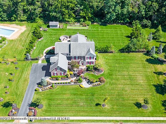 Welcome home to The Ridings at Cream Ridge! An elegant estate home development nestled in the surrounding protected land of Cream Ridge offering 24 hour security and supreme privacy yet conveniently located to major roadways, shopping, dining, 2 exceptional golf courses/winery, parks, playgrounds & many other outdoor activities. This is the Chelsea Model set on a 1.03 ac. premium lot backing to woods provides privacy. with a custom floor plan designed by the owners and provided by Toll Brothers builders. An outstanding 5 bedroom, 5 bath home with all the amenities you could ever want. The style of this home is perfect for all! A sprawling sunken great room w/wood burning fireplace offers a warm & cozy gathering space for all to enjoy and will be the center focus of all your gatherings. The owners opted for the fabulous upgrade to the very desirable Palladium gourmet kitchen offering the full Jenn Air SS appliance package, a 6-burner gas cooktop with large oven below, and a double wall oven/microwave combination, a center island with an elevated breakfast bar w/stools, gorgeous granite countertops, pantry, updated stylish flooring, gorgeous granite countertops with abundant cabinet and counter space & custom ceramic backsplash. From here you can access the extensive amenities in the backyard! A full-service roof covered outside entertainment area complete with Trek decking and a vast paver patio w/firepit on one side and a wood burning fireplace with mounted TV above on the other, outdoor heaters & built in sound speakers for all your outside entertainment needs! A beautiful granite/stone counter/bar area with built in ss fridge & abundant seating for all! Don't forget the custom bocci ball court! All these amenities are secured by complete fencing and the yard backs to the woods. Once you are back inside you will be greeted by the impressive 2-story foyer that leads you around into the living room to the right and formal dining room off to the left w/tray ceiling and crown moldings. There is also a centrally located first floor office and a great laundry/mud rooms with a second exterior front door entrance convenient for those rainy days! All new w/w carpet just installed in second floor brs. The second level offers gorgeous H/W floors and an amazing owner's suite providing your own sanctuary away from the rest of the bedrooms offering dual walk in closets, tray ceiling, and a sitting area. The luxurious primary bathroom offers a soaking tub, dressing area, double sinks, and a separate shower. There is an expansive bonus room over the garage professionally completed by the builder offering added living space for anything you want to use it for, (5th bedroom, media/office/playroom area) complete with central air/heat. There is even more added living space with the amazing lower level also professionally completed by the builder offering an open floor plan to include a large recreation/entertaining room, a half bath, recessed lighting, another upgrade by the owners adding a custom stairway down to this level, and a full walk upstairs to the awesome backyard. Outstanding professional landscaping with pavers & hardscapes and underground sprinklers, and a 3-car garage, vinyl storage shed in backyard, security system, and a top-of-the-line water conditioning system complete this wonderful home set in a very desirable community with exceptional schools! Come take a look as soon as possible!