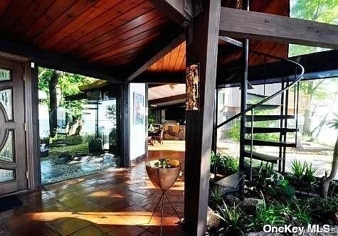 - Exterior features: Architecture Style: Contemporary, Beach Front, Cathedral Ceiling(s), Driveway, Electric Water Heater, First Floor Bedroom, Formal Dining, Garbage included in rent, Granite Counters, Heating: Oil, Laundry Room, Mailbox, Master Downstairs, Patio, Porch, Primary Bathroom, Skylight(s), Sound, View Type: Skyline, Walk Through Kitchen, Waterfront, Wood Burning