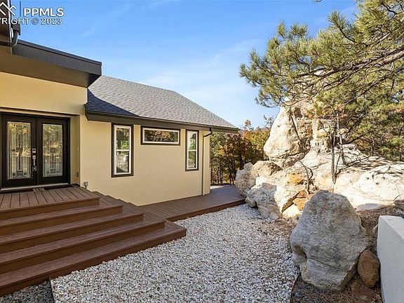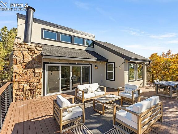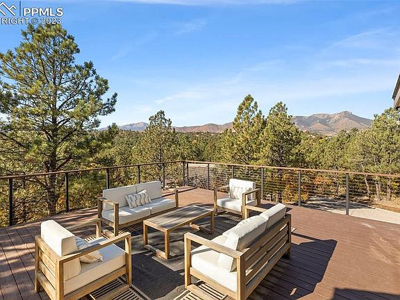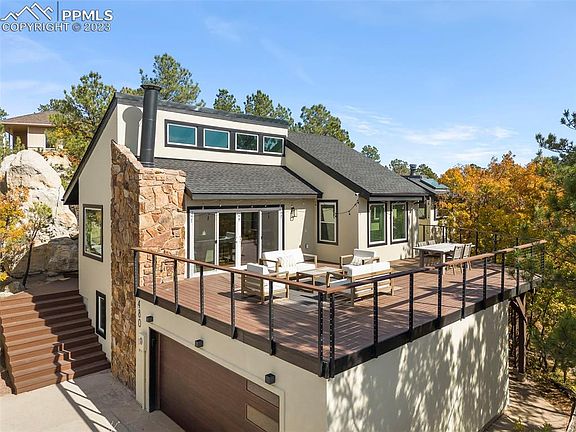 Introducing a most exquisite mountain retreat w/striking interior & exterior updates * This gorgeous Mid-Century Modern 4 bed / 5 bath Raised Ranch features an extraordinary Chef's dream of a kitchen w/top-of-the-line WOLF appliances, a sprawling 15-ft island & plumbed Miele coffee machine ~ Flowing from the kitchen is the warm & inviting dining room boasting a second fireplace, creating an ideal ambiance for entertaining ~ A remarkable home, showcasing awe-inspiring views of Pikes Peak as well as beautiful vistas from every window ~ The magnificent living room offers vaulted ceilings, exposed beams & a unique copper-clad fireplace, panorama windows & expansive 12-ft sliding doors connecting this wonderful space to a generous wrap-around deck, creating a seamless outdoor extension of the interior living area ~ Further upgrades include replacement of the entire house siding w/durable acrylic/synthetic stucco & a brand new roof ~ New windows & skylights bathe the interior in natural light, complementing the new interior doors & carefully selected lighting fixtures ~ A spacious lower level workshop adjoins the garage & provides ample room for year-round projects ~ Additional improvements include a new garage door, updated powder room & new designer gas fireplace in the dining room area ~ Modern railings surround the large deck, w/new front stairs adding to the overall appeal of this home ~ Fresh interior paint highlights the Acacia wood flooring gracing the entire main level ~ Lower walk-out level offers 4th bedroom, sitting room, office, 3/4 bath & a full kitchenette ~ New furnaces, AC units & a central vacuum system ensures contemporary comfort ~ A marvel of a home & an entertainer's delight offering a harmonious blend of refined elegance and scenic beauty ~ Sitting on .64 acres of treed privacy, served by top-ranked Academy School District 20, near hiking trails, shopping, restaurants, USAFA & I-25 for easy access to Denver, this incredible property is a Must-See!