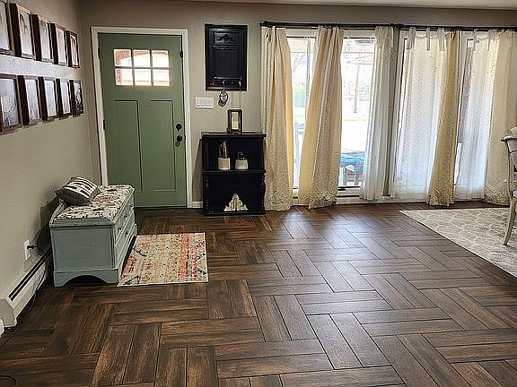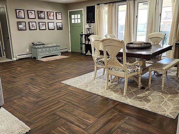 The living room features a cozy wood-burning fireplace and plenty of space to entertain. The house features central AC and baseboard heat.