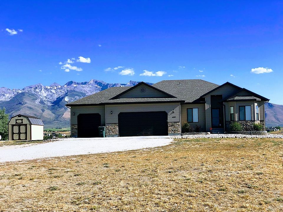 Back on the Market!! This beautiful home is an absolute must see! Home has been lovingly maintained it is a Bailey built Oxford model with a fully finished basement. Home has 5 bedrooms, 3 full bathrooms and it sits on 2 acres with views of the Ruby Mountains. Kitchen is antique white with soft close cabinetry, large kitchen island, large gas stove, all granite countertops, stainless steel appliances, with plenty of cabinets for extra storage. Stone work around the main pellet stove is stunning. Main level has 3 bedrooms, 2 full baths, a great room consisting of the open kitchen, dining room and living room with vaulted ceilings and full laundry room. The home includes upgraded Hunted Douglas blinds throughout and a water softener system. Master bedroom on main level has a wall mounted fireplace, walk in closet, master bath is tiled with a jetted tub. Basement is expansive, with two more bedrooms, one full bath, big living room with a pellet stove. Outside has a large deck and brick patio with fire pit and play area for kids. Large three car garage with overhead storage racks. This home is beautiful, easy to show and the view is absolutely spectacular! Schedule a showing today