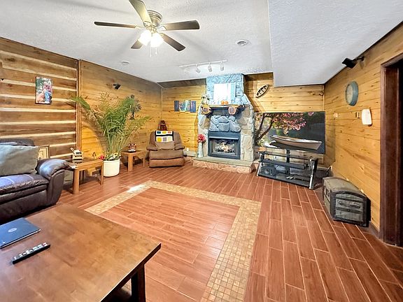 Welcome to This Beautiful 2-Story Log Home with Seasonal Water View! This spacious 4-bedroom, 3-bath home offers multiple living areas and plenty of room for family and guests. The fully finished basement features a second living space complete with an eat-in kitchen boasting an island and breakfast bar, a cozy living room with gas fireplace, and a full bath. On the main level, you'll find a warm and inviting den with gas fireplace, along with two bedrooms and full bath. The primary bath offers a separate shower, double vanities, and a whirlpool tub, with convenient access from both the main bedroom and the den. The upper loft area provides a bonus/rec space, another bedroom, and a full bath. Outdoor living is just as impressive with a refreshing pool, detached garage, and detached carport. This home is perfect for those seeking a private retreat with space to entertain, relax, and enjoy. Just minutes from Hickman Creek Boat Dock, Cumberland River, and Land Between the Lakes.