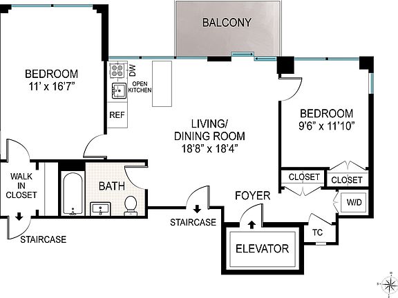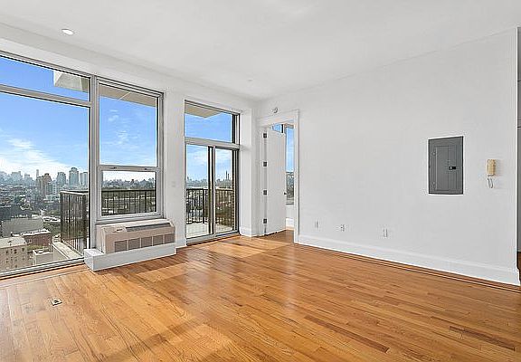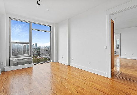 Sunny southern exposure at SkyHigh Williamsburg. Amazing views as far as the eye can see of the entire New York City skyline from every room with oversized floor-to-ceiling windows. Spacious master bedroom fits California King bed with two nightstands and dressers. Walk-in closet. Large double closet in the second bedroom. Private balcony, washer and dryer, direct elevator entrance, tall ceilings, dishwasher, private garbage chute, heated bathroom, lots of closets, hardwood floors. Note the photo shows the original kitchen but a new renovated kitchen will be included. Building amenities include a roofdeck, fitness room, bicycle storage, and indoor parking garage featuring ELECTRICAL VEHICLE (EV) CHARGING STATIONS at every parking space.. Parking is additional and subject to availability. Pet friendly. Five minutes to Graham Avenue L train subway station, and G train nearby. Close to McGolrick Park, Cooper Park and McCarren Park.