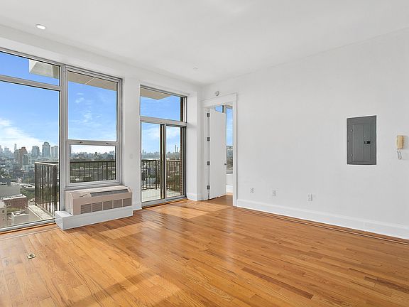 Sunny southern exposure at SkyHigh Williamsburg. Amazing views as far as the eye can see of the entire New York City skyline from every room with oversized floor-to-ceiling windows. Spacious master bedroom fits California King bed with two nightstands and dressers. Walk-in closet. Large double closet in the second bedroom. Private balcony, washer and dryer, direct elevator entrance, tall ceilings, dishwasher, private garbage chute, heated bathroom, lots of closets, hardwood floors. Building amenities include a roofdeck, fitness room, bicycle storage, and indoor parking garage. Parking is additional and subject to availability. Pet friendly. Five minutes to Graham Avenue L train subway station, and G train nearby. Close to McGolrick Park, Cooper Park and McCarren Park.