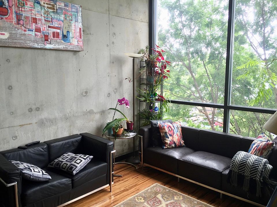 Beautiful, modern loft in Old Fourth Ward! This gorgeous loft features floor to ceiling windows, wood floors, concrete walls, 10ft ceilings, spacious living area, and a private balcony. A lovely open plan kitchen contains stainless steel appliances and granite countertops. An in-unit washer and dryer, and a walk-in closet with custom Elfa shelving maximize convenience. The community rooftop features a heated salt water pool, fireplace, fitness center, lounge, & the best sunset views in the city! Fabulous location directly on Freedom Park Trail & steps to the Atlanta Beltline. Spitting distance from an awesome dog park, Old Fourth Ward Park, The King Center, Krog Market, shops on North Highland, and Ponce City Market. Includes 1 gated parking space and plenty of guest parking. Excellent building management. One cat or small-to-medium dog okay with pet deposit. One of our favorite things about this apartment is sitting in the sun filled living room, watching the birds nest in the tree canopy just outside the south-facing, floor-to-ceiling windows. One of our second favorite things is living above Condessa, Atlanta's best coffee shop. We'll really miss living here! Owner pays HOA dues and H2O, tenant pays electricity. One cat or small-to-medium dog okay with pet deposit.