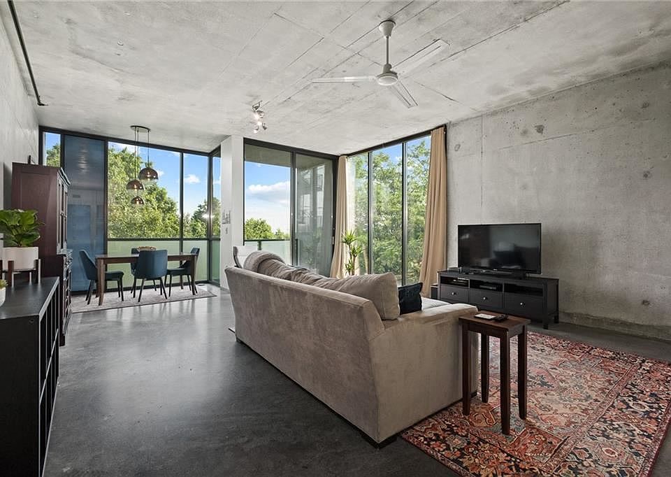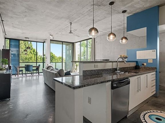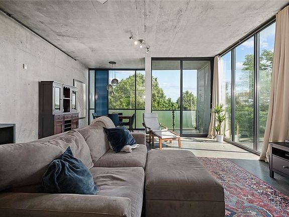 Immaculately-maintained Tribute Lofts 2/2. Enjoy true loft living in this 5th floor unit, complete with concrete floors, 12 foot high ceilings, plentiful natural light, and easy Intown access. The open concept kitchen features a breakfast bar, stainless steel appliances, granite countertop, and modern cabinets. Floor-to-ceiling windows provide plenty of light in the living and dining areas. Two bedrooms feature en suite bathrooms with modern tile. The Tribute Lofts community offers a rooftop pool overlooking the Atlanta skyline (that becomes a jacuzzi in the winter!), outdoor lounge area, fitness center, and more. Other amenities include 2 designated parking spots, a coffee shop and other retail on the main level of the development, plus easy access to a dog park. This unit has a new water heater and has been extremely well maintained.