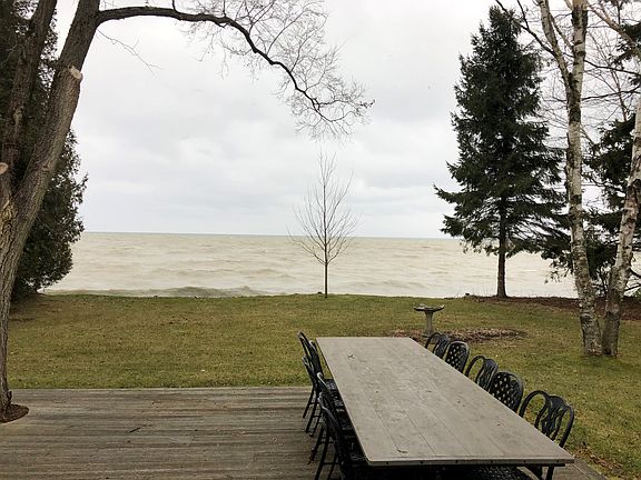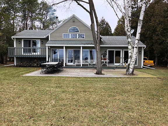 Open concept living with views of Lake Michigan from most rooms High cathedral ceilings with open beams, palladium windows and pine floors. Stone wood-burning fireplace with insert. Glass doors to huge patio. Deck off master bedroom, partial basement plus crawl space. Home was custom built for first of two owners. Sand and small stones on beach with six steps to beach. Wonderful sunrises and moonrises. Enjoyment year-round.