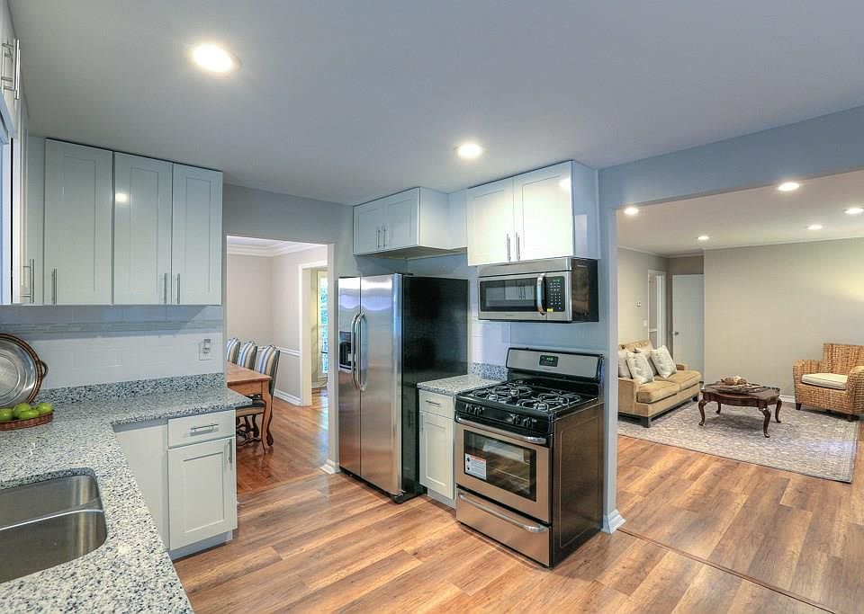 Renovated 4 bedroom/2 bath RANCH with huge unfinished basement waiting for you to customize as you like! refinished hard woods through living room/dining room/hall & bedrooms. All new kitchen (cabinets, granite counters, appliances). Laundry moved from basement to kitchen. All new Baths (cabinets, granite counters, tiled shower/tub, new tile floors). Close to Roswell Rd and all the busyness it offers, but you are nestled in a quiet neighborhood and it feels worlds away. Level & private backyard. Fence behind the tree line will make it easy to fence in backyard.