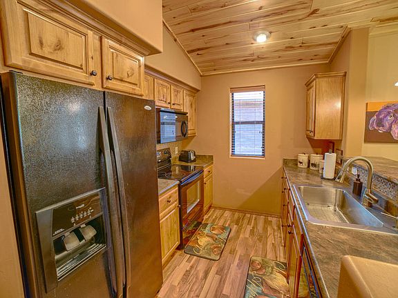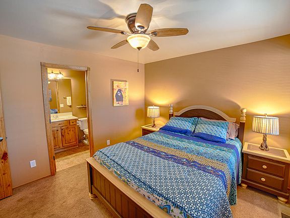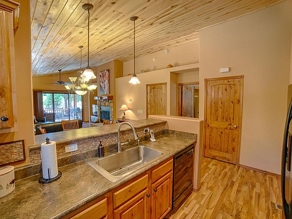 Charming cabin on the 17th Tee at Bison Crossing. Open floor plan with Great Room/kitchen combo and triple slider door out to the covered back deck looking toward the tee. Two master bedrooms, rocked gas fireplace, glass tile back-splash in kitchen and baths; also, upgraded laminate flooring and upgraded ceiling fans and lighting throughout the home. Backyard has been fenced in and seller has planted aspens and blue spruce. Detached 2.5 car garage provides plenty of storage and has been finished off inside. Bison Crossing is a gated community close to everything in Show Low including golf, swimming, Fool Hollow Lake, shops, movies and restaurants. Ask to see this one today!