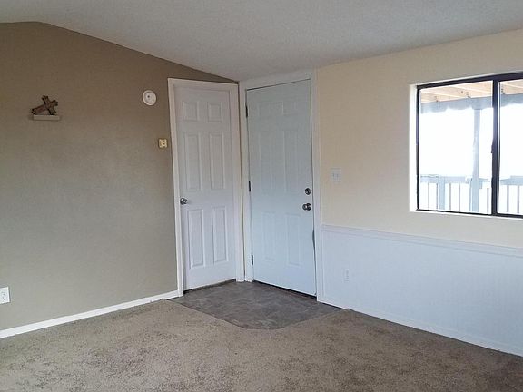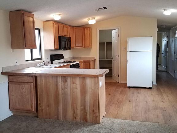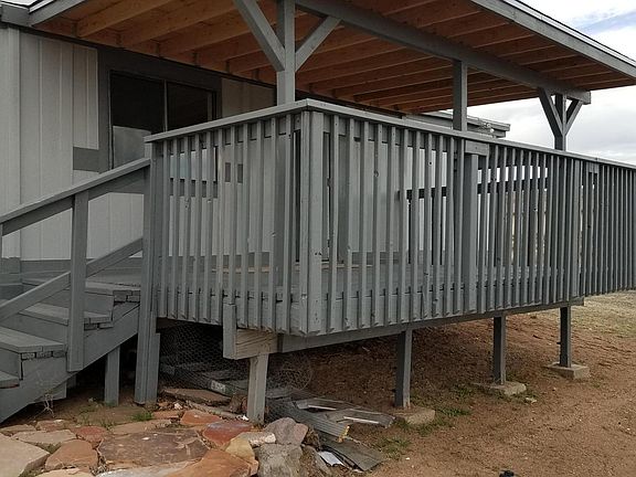 Fresh paint exterior/interior on well kept large 2bd/2ba singlewide 896sqft. New carpet, double pane windows. Newer evap cooler. Large living room light and bright. Walls are drywall. All kitchen appliance convey including washer/dryer. Also new durable paradigm-water proof vinyl plank flooring has been installed. Enjoy east front view of state land off your 10x18 covered deck. Home has new roof. Come take a look as pronghorn gaze in the nearby open fields.