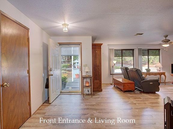 Well maintained, recently painted, 3 bed / 2 bath., 2,050 sf, single story home, built in 1989, with 3 car 36' x 24' detached garage w/an approximate 32' x 20 living area above. 22' x 22' two car detached garage converted to office/sewing/general use. 3rd bedroom is exceptionally large, now being used as family room. 12' x 18' garden shed w/concrete floor, cold water sink, & is squirrel/rodent proof. This low maintenance property is tucked away on 2.76 level acres w/a paved driveway, electric security entrance gate & 8ft fence around most of the property. RV parking with full hookups for any size motorhome. Roof is 9 yrs. old. Pellet stove in living room and family room. Covered, concrete back yard patio w/ hot tub Home is wired for large generator, but no generator is included. New window coverings throughout. Separate laundry room with storage. Kitchen & laundry appliances included . New window coverings included. Large kitchen with pantry. One year home warranty included.