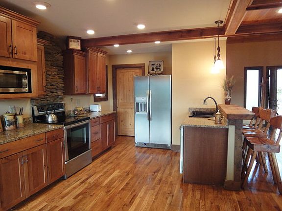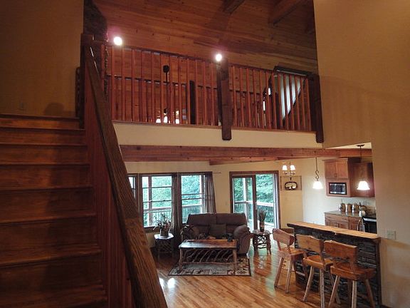CHARMING MOUNTAIN CABIN WITH SPECTACULAR VIEWS and COMMUNITY NEW RIVER ACCESS! Bring your kayak and fishing poles to the New River access, just a short walk through the woods or short drive around the bend. Well built and well maintained, this all-cedar mountain getaway is a perfect income producing vacation rental or second home. Open floorplan, floor-to-ceiling stone fireplace, rustic kitchen with granite/stainless. Large covered balcony with fantastic views of Phoenix Mountain. A bit of tree trimming will open up views of the river! Main floor Master suite has its own balcony access with views, jacuzzi tub w/separate dual head shower. Upstairs balcony area leads to 2 bedrooms, full bathroom and loft study area. Lower deck w/hot tub view. Nicely landscaped and a great back yard with pond, horseshoe throw, firepit and even MORE mountain views! Large lot with room for garage. Lower level is partially finished out for separate rental or guest quarters. Friendly subdivision with great neighbors and low POA dues. Vacation rental ready-fully furnished down to linens and kitchen supplies.