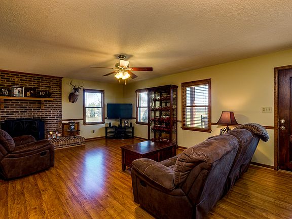 This country home with breath taking views from the front porch is calling your name. Well appointed, completely remodeled brick ranch with new appliances and granite counter tops setting on 7.5ac. Professionally landscaped. Outdoor lighting, irrigation system from 2ac pond that has a sand beach over looking a fountain and dock for fishing. 30x50 finished garage and 15x15 office{Both are heated and cooled} and additional sheds for a total of 60x50 and another 45x50 building. A must see home.