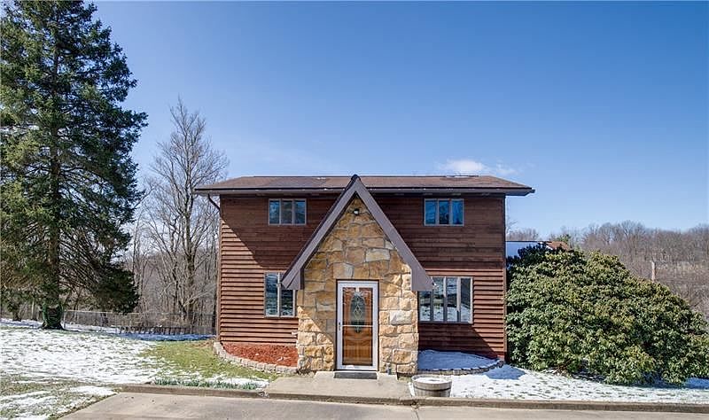This solid, spacious home is waiting for your updates. 3 bedrooms, 2.5 baths, on 3.2 acres. Enter into adorable and convenient foyer. Large living room with fire place. Large dining room and kitchen with tons of natural light. Kitchen features island and cathedral ceilings. Dining room features wood pellet stove for cozy winters. Powder room off of dining area. Patio doors lead to large deck and scenic views. 3 nice sized bedrooms and 2 full baths on second floor. Finished basement would make great 4th bedroom/home gym/office. Tons of storage. Large yard is perfect for gardening. 24x48 detached garage.
